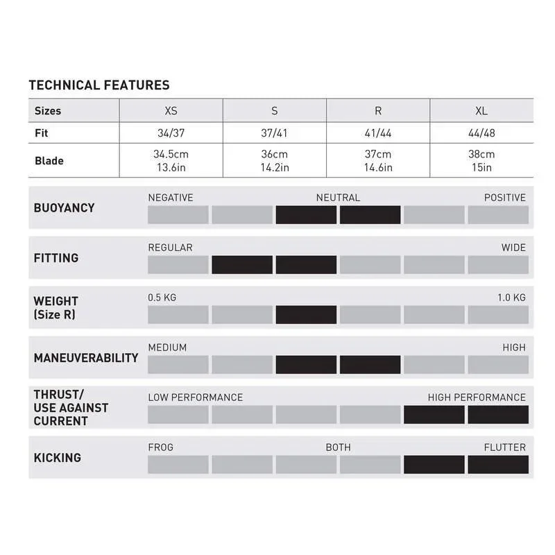 Soft longitudinal inserts allow a controlled deformation of the fin blade while kicking. This channel shape moves a greater amount of water resulting in more thrust for the same effort.